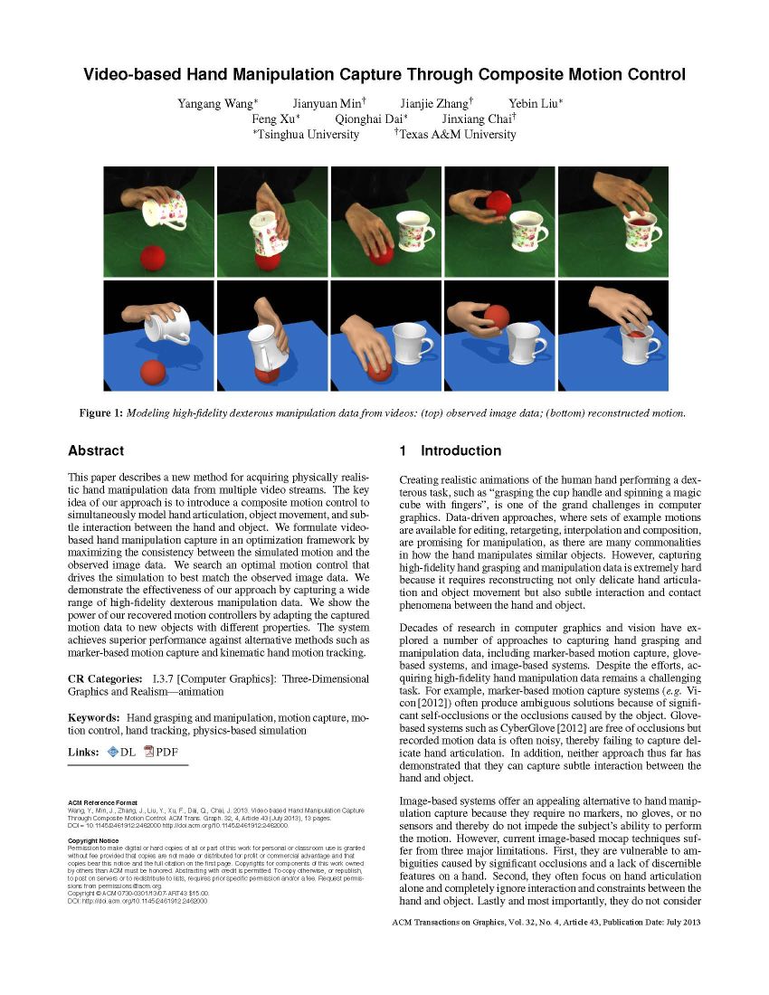 Yangang Wang, Jianyuan Min, Jianjie Zhang, Yebin Liu, Feng Xu, Qionghai Dai and Jinxiang Chai. "Video-based Hand Manipulation Capture Through Composite Motion Control". ACM Transactions on Graphics, 32(4), Article No.:43, 2013.