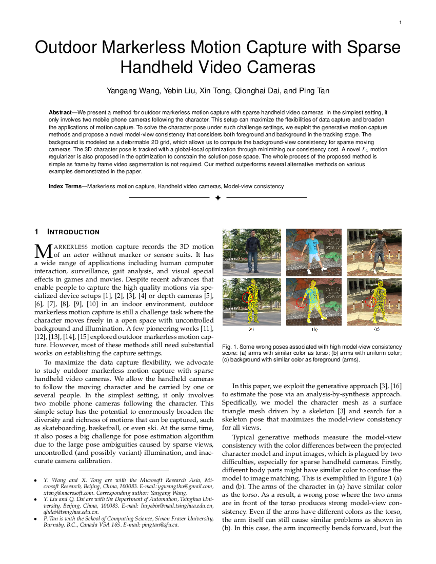 Yangang Wang, Yebin Liu, Xin Tong, Qionghai Dai and Ping Tan. "Outdoor Markerless Motion Capture with Sparse Handheld Video Cameras". IEEE Transactions on Visualization and Computer Graphics, 24(5):1856-1866, 2018.
